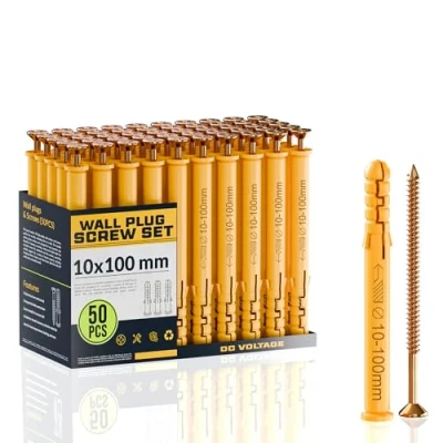 DC VOLTAGE 50 Pcs Wall Plugs and Screws Set 10mm x 100mm Concrete Fixings Expansion Anchors Kit Hanging Mounting TV Mount Drywall Self Tapping Screw Plug