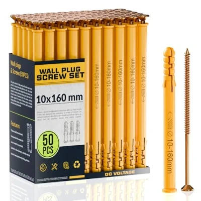 DC VOLTAGE 50 Pcs Wall Plugs and Screws Set 10mm x 160mm Concrete Fixings Expansion Anchors Kit Hanging Mounting TV Mount Drywall Self Tapping Screw Plug