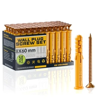 DC VOLTAGE 50 Pcs Wall Plugs and Screws Set 8mm x 60mm Concrete Fixings Expansion Anchors Kit Hanging Mounting TV Mount Drywall Self Tapping Screw Plug