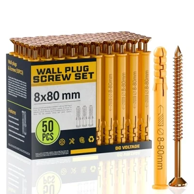 DC VOLTAGE 50 Pcs Wall Plugs and Screws Set 8mm x 80mm Concrete Fixings Expansion Anchors Kit Hanging Mounting TV Mount Drywall Self Tapping Screw Plug