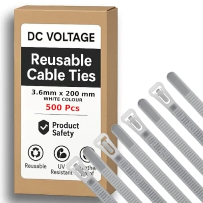 DC VOLTAGE 500 Pcs Reusable White Cable Ties, 200mm x 3.6mm, 8" Adjustable Plastic Tie Wraps Heavy Duty Releasable Strong Nylon Zip Ties for Home Office Garage and Workshop (3.6 200 mm White)