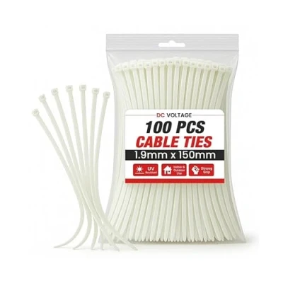 Strong & Durable Build: Made from industrial-grade nylon 66, these clear white cable ties offer high tensile strength and durability, ensuring a reliable hold for indoor and outdoor use. Secure Self-Locking Design: Designed with a self-locking mechanism that grips tightly once fastened. No slipping or loosening, perfect for cable management, garden use, and more. Weather & UV Resistant: Built to withstand extreme temperatures and UV exposure, ideal for outdoor installations in the garden, workshop, garage, or even industrial settings. Multi-Purpose Utility: Suitable for bundling wires, securing plants, organizing tools, or fastening items. A must-have for DIYers, electricians, and home improvement pros. Easy to Use: Flexible yet strong, simply insert the tail into the head and pull tight. Clean design with rounded edges to avoid cuts or damage when working with wires or cables. Generous Pack Size: Comes in a pack of 100 Nylon cable ties, measuring 150mm x 1.9mm, offering excellent value and coverage for any home or commercial project., Manufacturer: DC VOLTAGE
