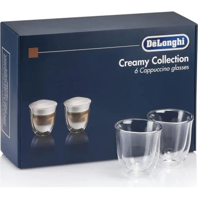 Keep your coffee warmer for longer with the De'Longhi Creamy Collection DLKC301 Double Wall Cappuccino Glasses. Their clever design keeps your coffee hot while leaving the glass cool enough to hold.If you prefer iced coffee, you won't get water rings on your table, because the glasses are condensation free.This 6-glass handmade set is ideal for family breakfasts or coffee mornings, and washing up is easy, because the glasses are dishwasher safe.