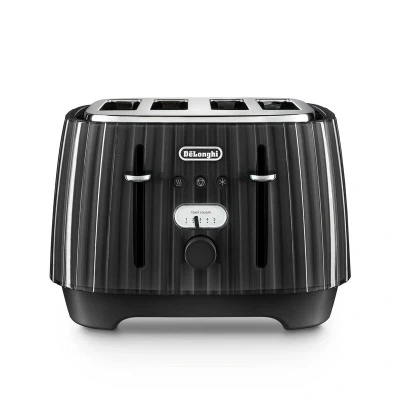 The De'Longhi Ballerina 4 Slice Toaster in Furnace Black combines Italian-inspired style with practicality, featuring extra-wide slots, independent controls for each pair, 5 browning levels, and easy-clean design—perfect for families or entertaining in an elegant kitchen.