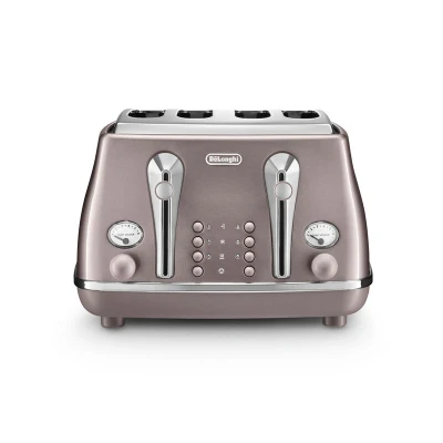 The De'Longhi Icona Metallics 4 Slice Toaster in Pink (CTOT4003.PK) features extra-wide slots, variable browning control, and elegant metallic accents, offering even toasting and versatile functions like reheat, defrost, and high-lift for safe removal—perfect for stylish, efficient breakfasts.
