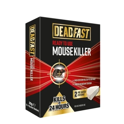 Deadfast Ready to Use Mouse Killer is pre-baited rodenticide in a bait box containing the fastest killing poison to stop mice infestations before becoming a problem. Kills in 24 Hours Includes tamper-resistant bait box Each box kills up to 50 mice Made with premium cereal blend For indoor use Deadfast Ready to Use Mouse Killer is pre-baited rodenticide in a bait box. It contains the fastest killing active, giving instant results to stop mice infestations before becoming a problem. The bait is made with a premium cereal blend to increase mice acceptance. How to Use: HOW TO USE - For use only in tamper resistant bait boxes. Read the label before use. Wear protective gloves. Do not open the sachets. Do not use where food, feed or water could become contaminated. Prevent access to bait by children, birds and non-target animals (like dogs, cats, pigs & poultry). Baits must be securely deposited in a way to minimize the risk of consumption by other animals or children. Where possible, secure the bait box so that they cannot be dragged away. BAIT POINTS- Low infestation - 1 X 10g pre-baited station every 5 metres High infestation - 1 X 10g pre-baited station every 3 metres BAIT PLACEMENT- Do not open the box. Place bait where mice are known to travel or where you have seen activity of mice. To maximise success, remove other food sources from the infested area. ADVICE DURING TREATMENT- Bait boxes should be placed for a maximum of 7-10 days. During treatment, every few hours search and remove dead mice. Formulation Content: Alphachloralose Disclaimer: Deadfast Ready to Use Mouse Killer contains Alphachloralose. Use biocides products safely. Always read the label and product information before use. Safety Information: Always read the product label before use. For full safety information please see the product Safety Data Sheet (SDS). The product contains a depressant and convulsant of the nervous system. Fast bronchial obstruction. The treatment is symptomatic, there is no antidote. Wear protective chemical resistant gloves during handling phase. Do not open the sachets. Do not use where food, feed or water could become contaminated. Prevent access to bait by children, birds and non-target animals (like dogs, cats, pigs & poultry). Keep locked up and out the reach of children. Where possible, secure the bait box so that they cannot be dragged away. Avoid release to the environment. Wash hands and exposed skin before meals and after use. WARNING Very toxic to aquatic life with long lasting effects. Use plant biocides products safely. Always read the label and product information before use To avoid risks to human health and the environment, comply with the instructions for use.