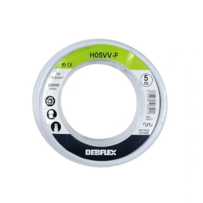 Flexible cable: The core of a flexible cable consists of multiple strands of copper with very small cross-section which gives the cable its flexibility. Reserved for special cases of installations subject to vibration or deformation, offering little space for wiring or difficult paths where flexibility is required ESSENTIAL: Cables and wires are the basic components of an electrician's toolbox. They are used to construct electrical power circuits throughout the house - Precaution for use: Choose the section - the length of the circuit and the nature of the circuit for an assured installation Uses: The H05VV-F electric wire is ultra strong and flexible; specially designed for indoor electrical installation. With a section 2 x 1.5 mm2. It is used as power, control, control, link and connection cable for household appliances Specifications: H05VV-F wire is made of copper wire and PVC insulation. It is multi-brown, which allows to be softer and lighter than a single-strand conductor. This feature allows you to reach a range of 5 meters. Its nominal voltage: 300 V - 700 V - Current: 10 A - Colour: White GUARANTEE & SATISFACTION - We are committed to providing you with warm customer service and answering any questions. Your satisfaction is our priority!, Manufacturer: Debflex