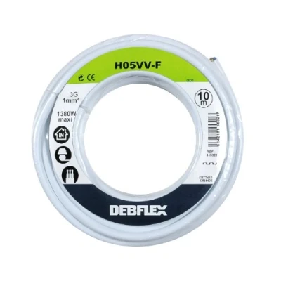 FLEXIBLE CABLE The core of a flexible cable is composed of several copper wires with very low cross section, giving the cable its flexibility. Reserved for special cases of installations subjected to vibration or deformation that provide little space for wiring or difficult paths where flexibility is required ESSENTIAL: Cables and wires are the basic components of an electrician's toolbox. They are used to build circuits throughout the house. Precautions: select section - the length of the circuit and the type of circuit for safe installation Applications The H05VV-F electrical wire is insulated, specially designed for indoor electrical installation. With a cross section 3G 1 mm². It is used as a power, control, control, connection and connection cable for household appliances Features: The H05VV-F wire is made of copper wire and PVC insulation. It is multi-coloured, making it more flexible and lighter than a single strand ladder. This special feature allows a range of 10 metres. Rated Voltage: 300V-700V, Current: 10A, Color: White International products have separate terms, are sold from abroad and may differ from local products, including fit, age ratings, and language of product, labeling or instructions., Manufacturer: Debflex