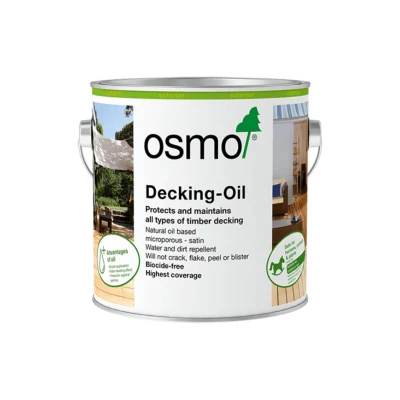 General description Osmo Decking Oil for Garapa wood is designed to enhance and protect wooden decking while maintaining the natural character of the wood. This oil is safe for humans, animals, and plants once dry, and it offers high resistance to water and dirt. Its microporous, penetrating finish prevents cracking, peeling, or flaking, and it does not require sanding when topping up the coating. Technical specifications Dry time: 12 hours Coverage: 24 m²/L with one coat Recommended coats: 2 coats, or one coat plus top coat of Osmo Anti-Slip Decking Oil 430 Moisture content max: 20% Surface preparation Bare wood species with high natural extractives need to weather for a minimum of 4 weeks before initial treatment or be cleaned with Osmo Brush Cleaner and Thinner. Resinous woods like Larch or Douglas Fir require at least 6 weeks of weathering. Pressure impregnated wood and tropical species such as Massaranduba, Bangkirai, Garapa, and Iroko need to weather for at least 3 months. Cedar