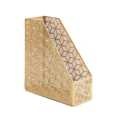 GLAM THEME: Indulge in the glamorous luxury of plush textures, dazzling details, and sleek finishes to elevate your home and add a sophisticated flair MADE OF IRON: Geometric magazine holder is made of solid iron material for lasting durability GOLD SATIN FINISH: It features a metallic gold finish for an elegant look GEOMETRIC GEOMETRIC MAGAZINE HOLDER: This is crafted with perforated geometric mesh with rectangular desk organizer SMALL SIZE: The gold metal magazine holder measures 5L x 10W x 12H inches, and weighs 1.2 lbs