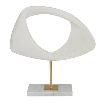 CONTEMPORARY DECORATIVE STATUE: Embrace artistic expression with a style that highlights bold designs with sleek lines, neutral elements, and a minimalist aesthetic POLYSTONE SCULPTURAL ACCENT: This white decorative sculpture is crafted from durable polystone, ensuring longevity WHITE AND BLACK HOME DECOR FIGURINE: Abstract decorative statue boasts a sophisticated matte white finish, complemented by an elegant gold rod that adds a touch of luxury and refinement ABSTRACT ACCENT STATUE: The polystone sculpture showcases a raindrop-inspired design mounted on a stand resembling a trophy-like silhouette, adding a modern touch to any space SMALL SIZE SCULPTURAL STATUE: The white polystone sculpture measures 11.90L x 3.15W x 12.50H inches, and weighs 4.13 lbs