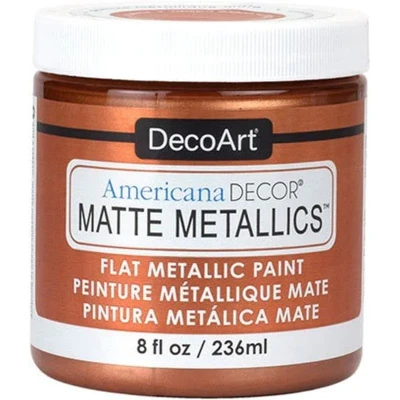 AMERICANA DECOR MATTE METALLICS PAINT. Achieve a high-end look on home decor and furniture pieces without the hassle of priming or sanding first by using the most advanced metallic acrylic paint available on the market. Use it for subtle accenting or full-coverage application. The patent pending reflective technology makes the light reflect evenly off the painted surface, resulting in a true metallic finish. Metallics comes in 14 traditional colors in an easy-to-use 8 oz, wide-mouth jar. One jar provides two-coat coverage on approximately 12 square feet.Durable. Uniform metallic shimmer. Non-toxic. Soap and water clean-up. Made in the USA https://decoart.com/metallics/matte-metallics . ADMMT15-36 CLDADMMT15-8OZ CLDADMMT15-8OZ MPN ADMMT15-36