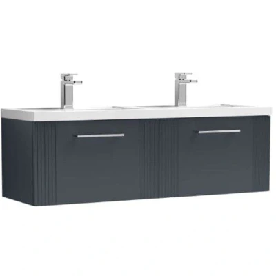 Retro inspired design with a modern twist, the Deco furniture range from nuie combines high quality manufacturing and contemporary design to produce an elegant unit for your bathroom. With a unique part fluted design, this vanity basin unit will be a stunning focal point in any bathroom. The unit has soft close drawers limiting daily wear and tear whilst providing a quieter closing action, ideal for the busy bathroom. Luxurious and functional the wall hung double basin unit is perfect for busier bathrooms, whilst the wall hung design gives the impression of more space in the bathroom. With a twin polymarble basin manufactured from high quality materials. Available in 5 stunning contemporary colours in a sleek satin finish. Choose from a crisp White, a cool Grey, a striking Anthracite, a contemporary Blue and a calming Green. The white polymarble basin complements all the colour options. Matching WC and tall units available for a consistent bathroom design. DIMENSIONS: W: 1205mm, H: 399mm, D: 390mm 5 year manufacturer's guarantee, Weight: 68.6078559344 Pounds, Manufacturer: nuie