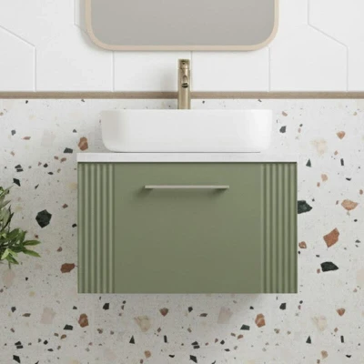 ManoManoGeneral description The Nuie Deco Wall Hung 1-Drawer Vanity Unit combines contemporary manufacturing standards with the elegance of Art Deco design. Its partially-fluted cabinet front and satin green finish evoke a natural aesthetic, making it a striking addition to any bathroom. The unit includes a laminate countertop in Bellato Grey, offering a stylish stone/concrete effect. Technical specifications Unit Height: 359mm Total Height (Unit + Countertop): 381mm Unit Width: 600mm Total Width (Unit + Countertop): 605mm Unit Depth: 383mm Total Depth (Unit + Countertop): 390mm Countertop Thickness: 22mm Weight: 15.00kg Cabinet Material: 16mm MFC Fascia Material: 18mm MDF Countertop Material: Laminate Countertop Shape: Rectangular Compatibility and accessories Compatible with matching side units and WC units in the Deco range Alternative handle designs and finishes available separately Installation Supplied rigid - no assembly required on the carcass/cabinet Includes pre-drilled blind holes