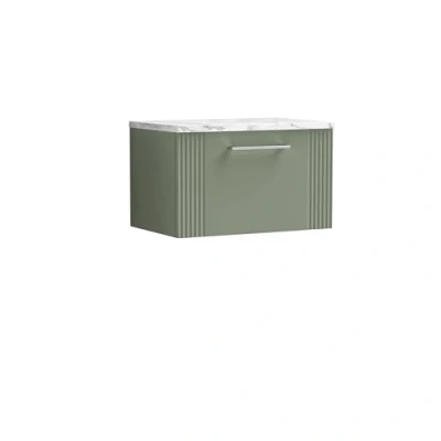 Deco Wall Hung 1 Drawer Vanity Unit with Carrera Marble Worktop 600mm Wide Satin Green Nuie
