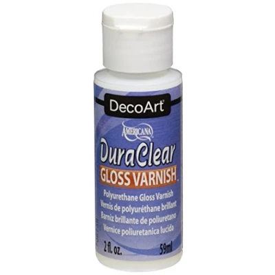 DecoArt Duraclear Gloss: Brush-on polyurethane, non-yellowing varnish that forms a tough, flexible, clear finish. Dries quickly. Can be used on most hard craft surfaces, both interior and exterior. Available in satin, gloss and matte varnishes in both 2 oz. and 8 oz. sizes. Apply on Wood, Plaster, Tin, Resins, Ceramic bisque, Papier Mache, Terracotta, and Plastic. Durable, non-yellowing, non-toxic. Forms a weatherproof, protective seal on both indoor and outdoor surfaces. Protects surfaces from chemicals such as alcohol and resists water stains or rings. Wont puddle. Brush strokes wont show. No smelly fumes. Clean up with soap and water. Can be used for decoupage crafts. DS19-3 CLDS19-2OZ CLDS19-2OZ MPN DS19-3