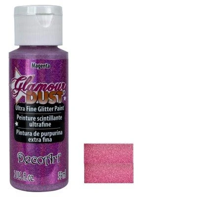 Magenta Glamour Dust Ultra Fine Glitter Paint 2oz. Features and Advantages: Ultra Fine elegant appearance Easy to brush and apply Great sparkle and shimmer Eliminates sprinkle-on glitter mess Base dries clear Safe and non-toxic Soap and water clean-up while wet Painting Surfaces: Wood Canvas Papier Mache Terra Cotta Ceramic Bisque for decorative purposes Glass for decorative purpose only Resin Plastic Styrofoam Gift Bags Most porous surfaces as a SINGLE 2oz bottle. For full details on how to apply and uses please refer to the Product Information page atwww.decoart.com There are 19 colours in the range to choose from with an additional range of 5 x Neon colours DGD16-30 CLDADGD16-2OZ CLDADGD16-2OZ MPN DGD16-30