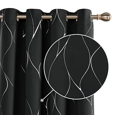 Deconovo Blackout Curtains Noise Reduction Silver Wave Line Foil Printed Thermal Insulated Eyelet for Bedroom Black W55 x L95 One Pair