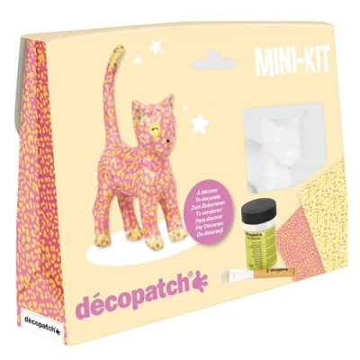 Décopatch Ref KIT012O Cat Mini Kit Suitable for Children Includes White Papier Mache Animal, 2 x Sheets, Brush & Pot of PaperPatch Glue