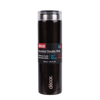 KEEPS DRINKS HOT FOR 4 HOURS: The Decor 300ml Travel Mug keeps your drinks hot for 4 hours and cold for 12 hours. Made with vacuum insulated stainless steel for superior thermal performance and designed to keep your coffee, tea, hot chocolate, herbal teas etc with that perfect fresh made taste. LIGHTWEIGHT AND STYLISH- Our 300ml Travel Mug has a slimline design is a convenient size for car cup holders, desks and a great on the go travel mug. The black colour has a beautiful gloss finish and is a great accessory to any outfit or occasion. Also available in Rose Gold, White and Graphite. SCREW TOP AIRTIGHT LID - you can be sure to avoid spillages while on the go. Our Travel Mug range is dual purpose for hot and cold use, making this the ideal all day re-usable drinking option. DÉCOR have over 60 years market experience of providing leading food storage, hydration and lunch solutions that are not only functional, exceptional value for money but also at the heart of our consumers needs.