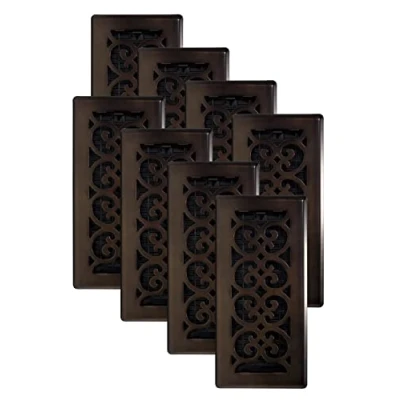Add style to your indoor AC/heat/HVAC vents with this decorative steel floor register with a high impact plastic damper box, now in a convenient 8 pack Scroll design, steel plated floor register in rubbed bronze finish Fits in a 4" x 10" floor duct opening; dimensions are for the opening in the floor - the damper will fit inside, the steel top will be slightly larger to sit on top of the floor Metal damper boxes rust and seize up, so we make our damper boxes with high impact plastic; this is not a cheaper option, it’s the best option Easy to install and maintain, simply wipe clean with a damp cloth; filter retainer and filter are sold separately, Manufacturer: Decor Grates