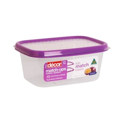 A well-organised kitchen is critical; when it comes to food storage. The Décor 500ml match-up basics meal prep tupperware box in Purple features handy measurement graduations & scratch-proof lids. These small containers are perfect for keeping your food fresh and ready to use. Available in 10 practical sizes & 6 colours, the Décor plastic food containers with lids are microwave, freezer and dishwasher safe whilst featuring a handy graduation marking & a specially moulded silicone seal to ensure a tight seal. The Décor match-up basics containers are the perfect way to store your food; the modular, stackable & deep nesting design means that you can easily stack multiple boxes on top of each other & maximise your limited space in your fridge or pantry. Colour-coded food storage containers - Find the suitable lid every time with the Décor match-up basics food storage containers. It is made from a clear durable, BPA-FREE plastic & featuring a unique colour-coded match system. Décor have been making re-useable products such as water bottles; food storage containers, microwave safe tupperware, lunch boxes and snack tubs for Australians for over 60 years; our products are beautiful, functional, affordable and made to last.