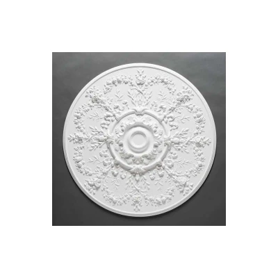 General description The Orac Decor R64 ceiling medallion features a stunning 37-inch diameter with delicate floral designs radiating from the center. This large ceiling rose is ideal for adding ornamentation to expansive ceilings, such as those found in foyers or ballrooms. Made from lightweight polyurethane, it can be installed quickly and easily compared to traditional plaster alternatives, making it particularly suitable for use above chandeliers. Technical specifications Diameter: 95.2 cm Length: 4.8 cm Material: Purotouch® Weight: Lightweight and sturdy Max. drilling diameter: 7 cm Basic color: White Adhesive consumption: Approx. 135 ml Compatibility and accessories Suitable adhesive: DecoFix Pro (interiors), DecoFix Power (exteriors/damp environments), DecoFix Ultra (seam joints) Installation Requires a few mechanical fixing points (screws or nails) for secure installation. Use DecoFix Pro adhesive for a gap and shadow-free adhesion. Comes with a fitting guide for easy