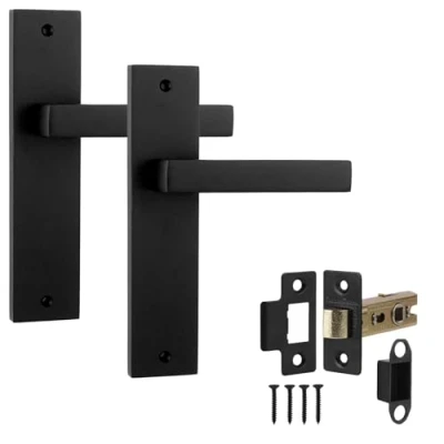 Aluminium matt black lever handle with a 200×45mm rectangular backplate, featuring a modern 120mm straight square design suited for diverse interior applications. Integrated 2.5in fire-rated tubular mortise latch, providing a comprehensive solution for functional and stylish backplate door handles in commercial and residential spaces. Balanced proportions inspired by art deco and contemporary design principles, reflecting Victorian backplate door handles with modern aesthetic refinements. Ideal for offices, bedrooms, and hallways, this set offers internal door handles with backplate and latch, ensuring seamless installation across new and existing doors. Supplied with all necessary fixings, the kit combines durable backplate door handles with refined matt black detailing for modern homes and professional environments., Weight: 1.212542441 pounds, Manufacturer: Decoranddecor