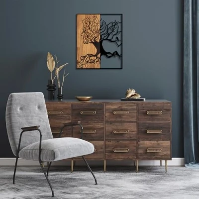 Enhance your home decor with this stunning decorative wooden wall accessory, featuring a unique blend of black and walnut colors for a modern touch. Crafted from 50% real wood (3 cm thick) and 50% durable metal (1.5 mm thick), this wall accessory combines natural beauty with sturdy construction. Measuring 49 x 3 x 58 cm, this versatile piece is perfect for any wall space, adding character and style to your living room, bedroom, or office. Easy to hang, this decorative accessory allows for effortless installation, making it a great addition to your home decor without the hassle. Each piece is unique due to the natural variations in wood color and texture, ensuring that your wall accessory is one-of-a-kind and adds a personal touch to your space.