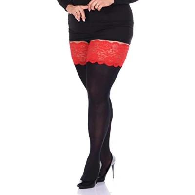 Deep Lace Top 100 Denier Hold Ups Plus Size Double Silicone Band (3XL/4XL, Black/Red Top)