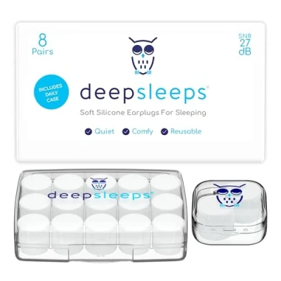 DEEP SLEEPS, POWERFUL NOISE REDUCTION: Struggling with noisy neighbours, snoring, or other distractions keeping you up at night? Our silicone ear plugs for sleeping provide up to 27 dB of noise reduction, giving you the peaceful, uninterrupted rest you deserve. Say goodbye to tossing and turning, and wake up feeling refreshed and ready to take on the day. REUSABLE, EASY TO CLEAN, AND DURABLE: Not your average single-use earplugs! Each pair is reusable for up to 7 days, easy to clean with oil-free soap and water, and comes with a hard case to keep them clean and safe during the day. Designed for long-lasting use without compromising on hygiene or performance. COMFORTABLE CUSTOM FIT FOR ALL EARS: Our ear plugs for sleeping noise cancelling are made from soft, BPA-free silicone that's hypoallergenic. It provides a true custom fit for ears of all shapes and sizes; You can easily resize this ear plugs sleep and remould it to create a secure but comfy airtight seal over the ear canal to block out unwanted background noises. VERSATILE NOISE PROTECTION FOR ALL OCCASIONS: Perfect for sleeping, traveling, focusing, and relaxing, these earplugs provide instant noise reduction wherever you need it. Whether you’re commuting, unwinding, or managing general noise sensitivity. HOW TO FIT: Simply roll the ear plug into a ball shape, gently press it over your ear canal, and hold for a few seconds to form an airtight seal. Then flatten it against your outer ear for maximum comfort and noise blocking. These earplugs are designed to cover the ear canal without being inserted inside. WHAT'S INCLUDED: A new, larger box containing 8 pairs of premium soft silicone ear plugs, 1 storage case and 1 daily carry case to keep the earplugs safe and clean. DESIGNED IN THE UK WITH PREMIUM QUALITY YOU CAN TRUST: We’re a family-run British brand dedicated to making great sleep accessible to all and to provide customers with the highest quality products that they can rely on each night., Backed by world-class customer care from our UK headquarters. Thank you for supporting small businesses!