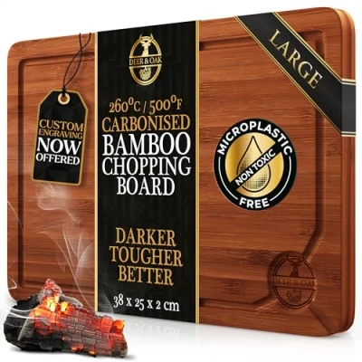 🔪 Extra Large Wooden Chopping Board – Designed for serious cooks, this oversized chopping board measures 38x25x2cm, perfect as an extra large chopping board for slicing meat, veggies, and fruit. 🌱 Durable & Sustainable Wood Cutting Board – Crafted from eco-conscious carbonised bamboo, this wood chopping board offers strength, longevity, and resistance to warping and cracking. 🔥 260°C / 500°F Carbonised Technology for Strength and Style – Each board is made from natural bamboo that has been carbonised through a 260°C / 500°F thermal treatment. This process enhances the bamboo's strength and durability, reduces moisture absorption, and results in a rich, dark finish. The result is a stable, long-lasting cutting board, that mimics the luxurious look of an end grain chopping board, it adds rustic charm to your kitchen. 💧 Functional Bread Board with Juice Grooves – Ideal for cutting bread and carving meat without mess, this bread board features deep grooves to catch juices and crumbs. 📏 ECO-FRIENDLY CHOICE: This large bamboo chopping board is not only hard-wearing and gentle on your knives but also a more environmentally friendly alternative to traditional wood boards. Perfect for eco-conscious cooks., Weight: 2.3368999772 Pounds, Manufacturer: Deer & Oak