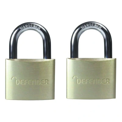 General description This twin pack of DEFENDER Aluminium Padlocks is ideal for securing sheds, medium boxes, and other storage areas. Both padlocks can be opened with the same key, providing convenience and security. They are designed with a hardened steel shackle and a solid brass body for durability and strength. The padlocks feature a pin tumbler cylinder and are double locking for added security. Each pack includes two padlocks and two keys, backed by a 2-year guarantee. Technical specifications Body width: 40mm Key type: Keyed Material: Solid brass body with hardened steel shackle Locking mechanism: Double locking pin tumbler cylinder Pack quantity: 2 padlocks Compatibility and accessories Compatible with standard hasps and locking mechanisms requiring 40mm padlocks Includes 2 keys per padlock Installation Insert the padlock shackle through the hasp or lockable item Turn the key to lock or unlock as needed Usage Use to secure sheds, storage boxes, gates, or other items requiring