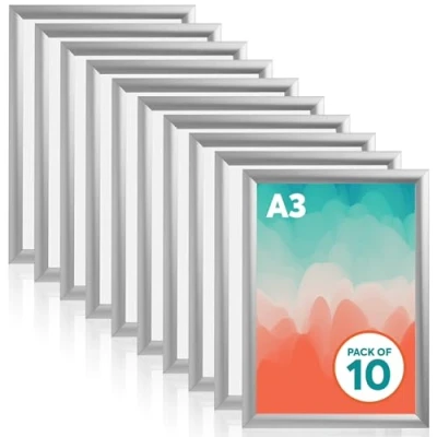 Deflecto A3 Snap Frame (Pack of 10) Elegant Silver Aluminium Clip for Wall Display Certificate and Poster Holder with Front Opening Clips