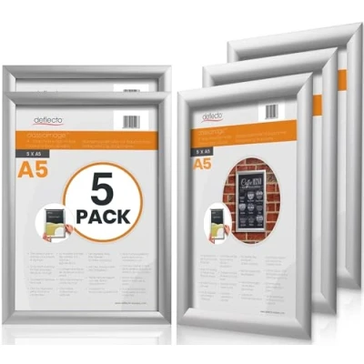 Deflecto Pk 5 x A5 Snap Frame Silver - Aluminium Clip Frames - Wall Mount Picture Frames - Posters Display Holder - Front Opening Picture Frame Clips