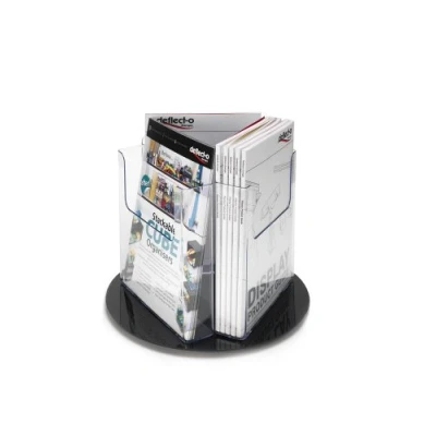 Three-pocket rotary carousel literature holder Countertop display Stable black base, crystal clear pockets Supplied ready assembled
