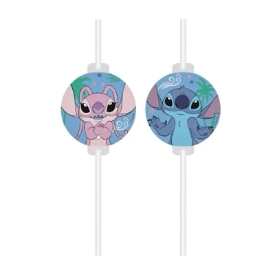 The Stitch&Angel Paper Medallion Drinking Straws Pack of 4 features eco-friendly, FSC-certified paper straws with vibrant medallion toppers of Stitch and Angel, perfect for adding a tropical, Disney-themed touch to parties and coordinating with other Stitch&Angel collection items.