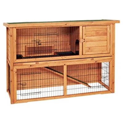 Wooden stall with two tiers for rabbits and guinea pigs. Outdoor run. Additional weather protection thanks to roofing felt. Easy to clean. Approx. 136 x 50 x 85 cm.