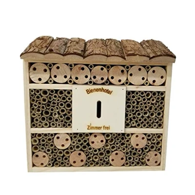 Generous insect hotel especially for wild bees Made from fir and pine, bamboo and plywood Well protected retreat for the whole year For easy hanging