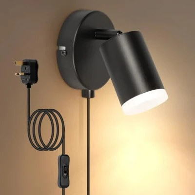 【Plug in Wall Light with Switch】Convenient ON/OFF switch and 120cm/47.3inch power cord can be installed anywhere there is an electrical outlet. More advanced with high quality metal and matte black color design 【Anti Glare Wall Mounted Lamp】Design with Acrylic front ring, effectively prevents glare and makes the light soft and not harsh. Suitable for your reading on the bed, teen studying, mainly used for bedside lamp, library, bedrooms, living room, kitchen, aisle, office, cafe, hotel 【GU10 Base】Maximum 7W per lamp holder for save energy and protect the environment(Halogen Lamps are not Suitable). This light fittings compatible with dimmer, dimmable when using dimming bulb and dimmer. Note: bulb not included 【Rotatable Wall Spotlights】Plug in wall sconce offer the perfect angle and atmosphere for your lighting needs with rotated 350° left and right, 90° up and down. Side table wall lamps with 1.2m cable for additional lighting, good to the eyes when reading indoor 【Easy to Install】The lampshade of the plug-in wall lights is removable for easy bulb replacement. Fixing the bulb, only need to connect the power cord to the electrical outlet, then push the ON button.