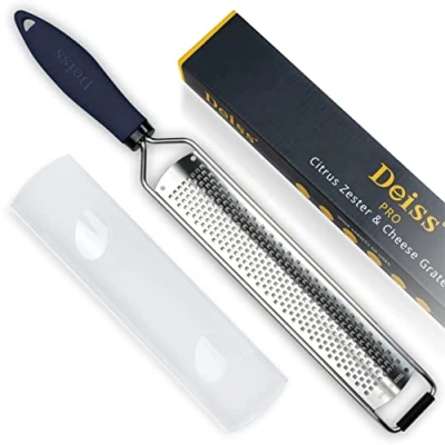 ✅ COMFORTABLE TO USE & BUILT TO LAST - The Hand Grater has a razor-sharp stainless steel blade that won't rust and a comfortable, non-slip handle. Its unique curved sides make it extremely rigid and allow you to apply more force when it's needed. ✅ SAVE SPACE IN THE KITCHEN AND DRAWER - Replace your bulky, unsafe, and hard-to-clean box grater, cheese grater electric, cheese grater with container or heavy electric food processor with a single Deiss Classic Zester Grater & Food Shredder. The metal parmesan cheese grater teeth won't clog up the way other graters for kitchen do, so it's a snap to clean. Just pass your cheese grader under running water. ✅ IMPROVE YOUR COOKING - Amaze your friends with new, restaurant-like recipes. Add strong new flavours with fresh lemon zest without any bitter pith taste. When using the chef zester with hard cheeses such as parmesan, you'll get a nice pile of grated cheese that melts almost instantly on hot pasta. ✅ ZESTING & GRATING HAVE NEVER BEEN SO SIMPLE - Shear the hardest cheese into grated fluff or get nicely shredded carrots using almost no pressure. Simply zip the zest grater cutter-knife across the rinds of oranges, lemons, and limes. In seconds, you can have finely grated garlic or ginger or treat yourself to a favorite dessert topped with fluffy chocolate flakes. ✅ LIFETIME WARRANTY - Deiss Kitchenware provides a lifetime warranty on its zesters for kitchen, grader for kitchen, rasp grater, zester grater with handle, carrot shredder, handheld cheese grater with handle. Plus you'll get the BONUS - exclusive "Healthy Cooking Tips" ebook - absolutely FREE!, Manufacturer: Deiss Kitchenware