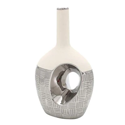 Elegant Modern Decorative Designer Ceramic Vase Round Curved with Hole in Silver / Rough / White Dimensions of the vase (L x W x H): 21 x 11 x 33 cm. Suitable for artificial flowers. Elegant designer vase with silver stripe for a stylish and modern furnished room. The vase is an exclusive craftsmanship and impresses with its excellent workmanship. An item made exclusively for Dekohelden24