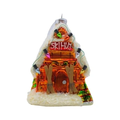 Dekohelden24 Lauscha Christmas Tree Decoration Baubles Glass Ornament Ski Hut Winter House in White with Colourful Details L x W H 8 7 11 cm