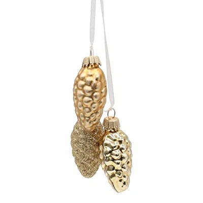 Lauscha Christmas tree decoration - mini pine cones, hand-decorated and mouth-blown. Size of each cone approx. 6 cm. One shiny, one matte and one glittering cone in gold on a textile ribbon. The pretty mini pine cones hang on a textile ribbon and thus conjure up a radiant festive shine and bring Christmas joy to any home. The beautiful Christmas tree decoration was mouth-blown, hand-decorated and handmade from Lauscha hollow glass. Whether as a window decoration or on the Christmas tree, the mini cones always come into their own. This beautiful Christmas decoration is a product from Lauscha in Thuringia and was made exclusively for Dekohelden24 Other great decorative and gift ideas can be found under the input "Dekohelden24" in the Amazon search field. We wish you lots of fun decorating and a beautiful contemplative Advent season.