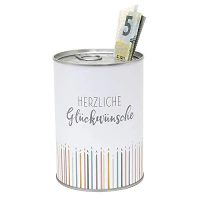 Metal money box in tin design. Design: Congratulations. Dimensions: diameter x height: 8.6 cm x 12 cm. With our money box, you can combine a money gift with a lovely message. It is also ideal for putting together with friends or colleagues and giving money. To empty the can, the metal lid can be easily opened like a canning tin with the tear-off tab. Weitere tolle Deko- und Geschenkideen finden Sie unter der Eingabe " Dekohelden24 " im Amazon Suchfeld.