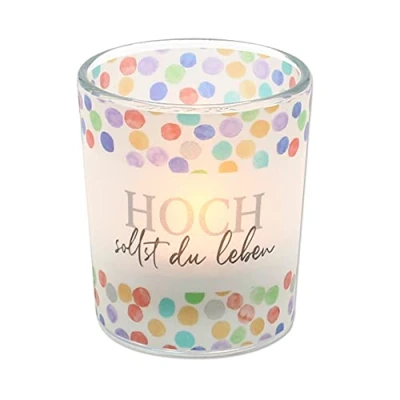 Lantern glass with motif on a transparent sleeve. Thanks to the included tea light, the motif is illuminated brightly. Motif: High should you live. Dimensions (H x D): 6 x 6.5 cm. Ideal for giving as a gift instead of a card or as a beautiful birthday table/table decoration. Special warm colours thanks to specially developed printing process. Our picture shows the front and back of a lantern. More great decoration ideas can be found under the input "Dekohelden24" in the Amazon search field.