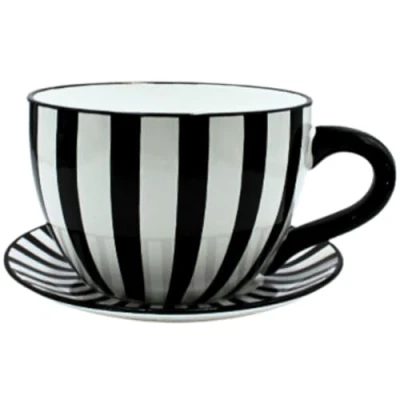 DECORATIVE CUP SHAPED POTTER This ceramic planter with handle is an original eye-catcher. The hand-painted black and white striped motif and glazed surface make it ideal for succulents, herbs or flowering plants and add charming accents to windowsills, balconies or in the garden. Wide Applications With a size of 34 x 28 x 16 cm, this planter is perfect as a planter for smaller plants or as a decorative bowl. It fits wonderfully in living rooms, kitchens or offices and provides a fresh atmosphere that enhances the ambience in style. EASY CARE & FUNCTIONAL The glazed surface protects the plant pot from moisture and makes cleaning easier. The generous design provides enough space for creative plant arrangements, making it both functional and visually appealing. CHARMING GIFT FOR PLANT LOVERS Whether for friends, family or colleagues? This planter is an ideal gift for anyone who loves plants. The unique mug shape design and vibrant black and white striped decor make it a special highlight that gives joy. Harmonious in any decor style: the black and white striped motif and subtle cup shape match modern, rustic or classic decoration styles. The planter blends seamlessly into different living environments and brings a cheerful touch to any room.