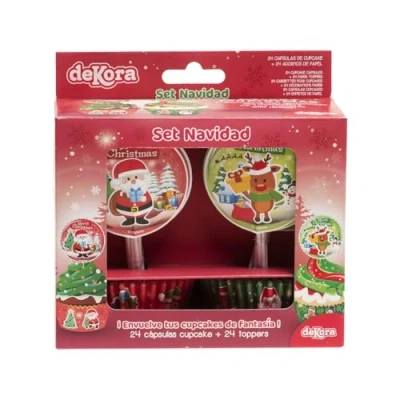 MERRY CUPCAKES: Are you more Team Rudolph or Team Father Christmas? Actually, you don't need to answer… With this baking decoration set, both will be the stars of your Christmas season! With the 24 cupcake cases and 24 cupcake toppers, you can decorate your cupcakes with the most festive and fun designs. The presents are already on their way on the Christmas sleigh! SWEETEN YOUR CHRISTMAS: With this cupcake decorating set, you can bake cupcakes that will shine in the most Christmassy colours and designs: reindeer, Christmas trees, snowmen... Let yourself be swept away by the Christmas spirit and create truly special and festive cupcakes for your family and friends. Father Christmas, Rudolph the reindeer and the entire dekora team wish you a Merry Christmas! QUICK AND EASY TO USE: This set for decorating Christmas cupcakes is perfect for you because it adds a festive Christmas touch to your baking without any hassle. Bake a batch of cupcakes and decorate them with our toppers, and you'll have the perfect dessert for Christmas Eve or the sweet treats you’ll leave for Father Christmas and his reindeer under the tree... LET'S GET BAKING!: No time to waste, start baking! You can rest assured that these cupcake toppers and cases are made from food-safe paper and cardboard, so they are completely safe for food. The paper cases are also heat-resistant and can withstand baking temperatures of up to 220°C. For perfect Christmas cupcakes, we recommend using them with dense batters and combining their use with a silicone or steel cupcake tray of suitable size. EXPERTS IN DECORATION: At dekora, we have one goal: to be there for every special moment in life, those that fill us with joy and we celebrate with so much enthusiasm. That's why we offer you an extensive catalogue of decorations for creative confectionery and patisserie for those special events that mark your life. With products suitable for vegans and people with intolerances and allergies, dekora has the design you need for every occasion., Manufacturer: Dekora Innova, S.A.U.