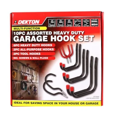 DEKTON 10PC Garage Assorted Hooks Max Capacity of 35kg Ideal for Hanging Tools, Coats, Bags, and More Durable, Rust Resistant Metal Construction Home, Garage, or Office