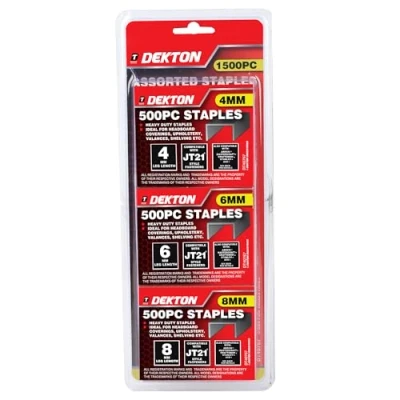 Universal Compatibility for Most Staplers: The Dekton 1500 Pcs Staples Set is designed to fit a wide range of staple guns and standard staplers, making it an ideal choice for both home and office use. These universal staples come in various sizes from 4mm to 8mm, ensuring you have the right fit for every project. Heavy-Duty Steel Construction for Maximum Durability: Made from high-quality, durable steel, these staples are built to last. They provide reliable performance, holding materials securely in place whether you're working on heavy upholstery, carpentry, or simple office tasks like stapling paper. Perfect for Upholstery, Carpentry, and Crafting: Whether you’re a professional or a DIY enthusiast, this versatile set of 1500 staples is perfect for upholstery work, carpentry projects, and various crafting tasks. The strong hold ensures fabrics, wood, and other materials remain in place without shifting. Variety of Sizes for Different Applications: This staples set includes sizes ranging from 4mm to 8mm, making it suitable for various applications. Whether you're dealing with thin or thick materials, these staples are designed to penetrate and secure them firmly, providing exceptional versatility. 1500 Staples for Ample Supply: The Dekton staples set includes a generous 1500 pieces, ensuring you have more than enough for your long-term needs. This large quantity is perfect for high-volume projects, minimizing the need for frequent restocking and ensuring consistent results across multiple tasks.